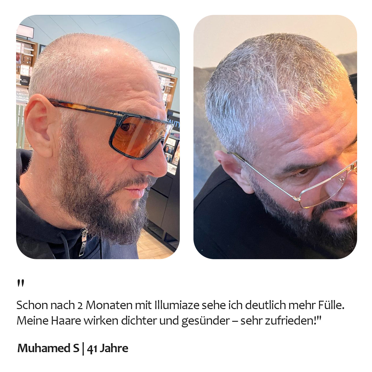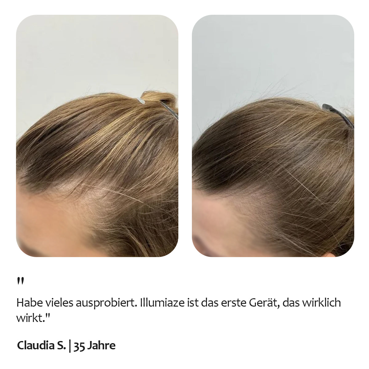 "Ich habe vieles probiert, aber Illumiaze ist das erste Gerät, das wirklich wirkt. Die kahlen Stellen sind fast weg und ich bin viel selbstbewusster."